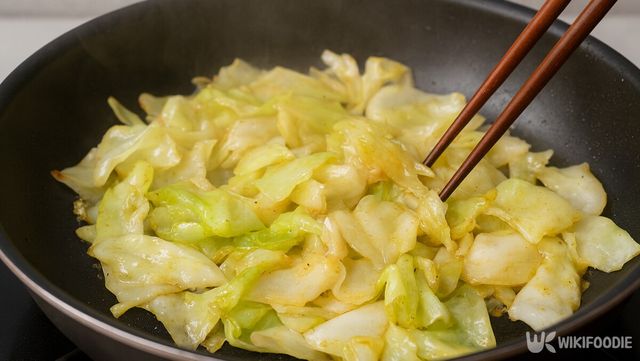 팬을 중불에서 충분히 데운 뒤 기름을 살짝 두른다. 손질한 양배추를 올리고 소금과 후추를 소량만 더해 볶는다. 양배추는 불 조절에 따라 식감이 크게 달라지므로 중불을 유지하는 것이 좋다.