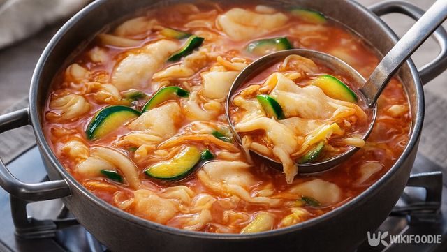 여기에 다진 마늘을 넣어 한 번 더 볶은 뒤 육수를 부으면 국물에 은은한 붉은빛이 번진다. 이후 기본 레시피와 동일한 순서로 채소와 만두피를 넣어 끓이면 얼큰한 국물이 완성된다.