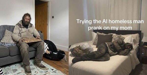 사진 속 후드티를 입은 30대 남성은 최근 'AI 노숙자 챌린지'에서 반복적으로 등장하는 인물이었다. 이는 AI 앱을 활용해 사용자의 집 사진에 노숙자 사진을 자동 합성해 넣는 방식이다.