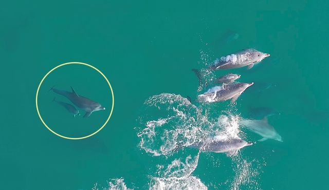 다큐제주 오승목 감독은 지난달 12일 제주시 구좌읍 종달리 해상에서 춘삼이 옆을 바짝 붙어 유영하는 새끼 돌고래를 처음 확인했다. 당시 새끼 몸에는 배냇주름이 선명하게 남아 있었다. 배냇주름은 새끼가 어미 뱃속에서 몸을 접고 성장하며 생기는 주름으로 출산 직후 일정 기간만 나타나는 흔적이다. 오 감독은 이 흔적이 또렷한 점을 근거로 새끼가 태어난 지 오래되지 않았다고 판단했다.