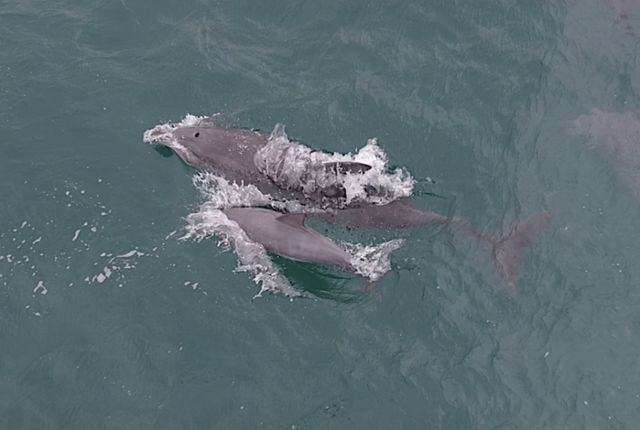 지난 11월 제주시 구좌읍 종달리 앞바다에서 남방큰돌고래 '춘삼이'가 새끼 돌고래와 함께 유영하는 모습이 목격됐다. 이 돌고래는 지난 2013년 수족관에서 자연으로 방류됐다. / 다큐제주, 제주대학교 고래·해양생물보전연구센터 제공