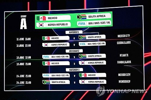 앞서 6일 미국 워싱턴DC에 있는 존 F. 케네디 센터에서 열린 2026 북중미 월드컵 조 추첨에서 한국은 멕시코, 남아공, 그리고 유럽 플레이오프 패스 D(덴마크, 북마케도니아, 아일랜드, 체코)와 A조에 속했다.