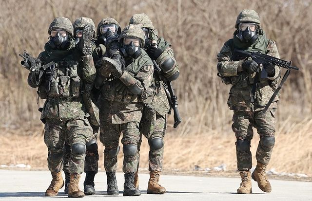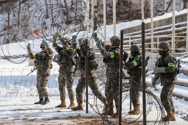 56사단 장병들이 혹한기 훈련 중 적의 침투를 저지하기 위한 중요시설물 방호훈련을 하고 있다. / 뉴스1