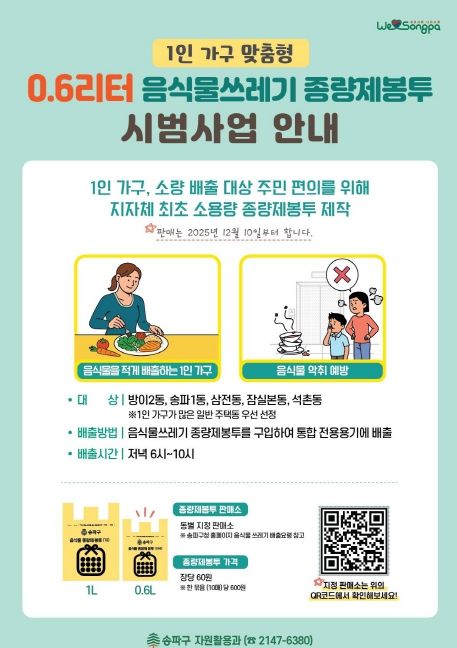 [파이낸셜경제=김영란 기자] 서울 송파구가 전국 지방자치단체 최초로 1인 가구에 최적화된 0.6ℓ 규격의 음식물쓰레기 종량제봉투를 오는 10일부터 시범 도입해 운영한다고 알렸다.