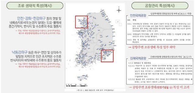 구체적으로 공항 확장·시설 추가 사업 평가 시 조류의 크기·무리형성 등 생태적 특성과 공항 내 포획·퇴치·충돌횟수 등 정보를 이용해 항공기와 충돌가능성과 심각도를 집계·분석한다. 이를 바탕으로 조류의 분포·이동·확산에 대한 변화 예측 자료를 만들어 항공기와 조류 충돌의 위험성을 살핀다.