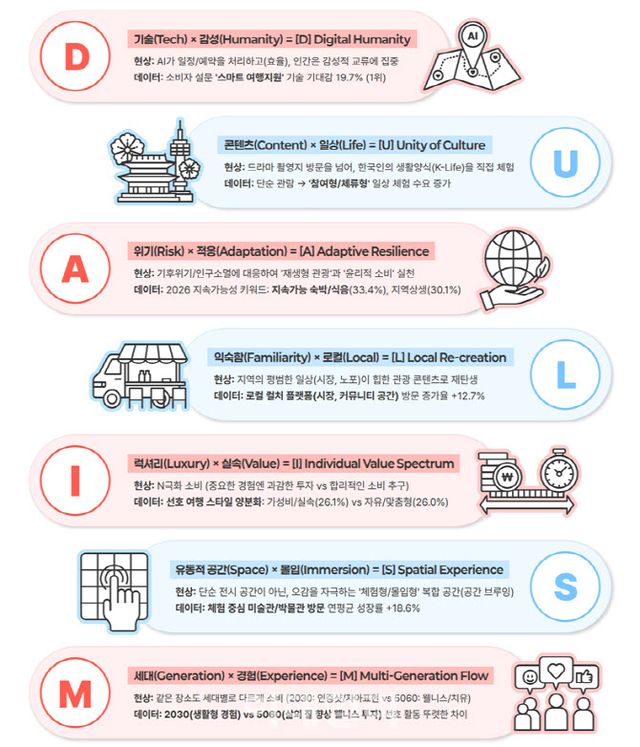 ‘D.U.A.L.I.S.M.’은 디지털 휴머니티(Digital Humanity), 문화의 일치(Unity of Culture), 적응형 회복탄력성(Adaptive Resilience), 로컬의 재창조(Local Re-creation), 개인 가치 스펙트럼(Individual Value Spectrum), 공간적 경험(Spatial Experience), 세대 간 흐름(Multi-Generation Flow) 등으로 구성된다. 기술과 감성, 위기와 적응, 럭셔리와 실속 등 상반된 가치가 융합되며 새로운 관광 생태계가 형성될 것이라는 예상이다.