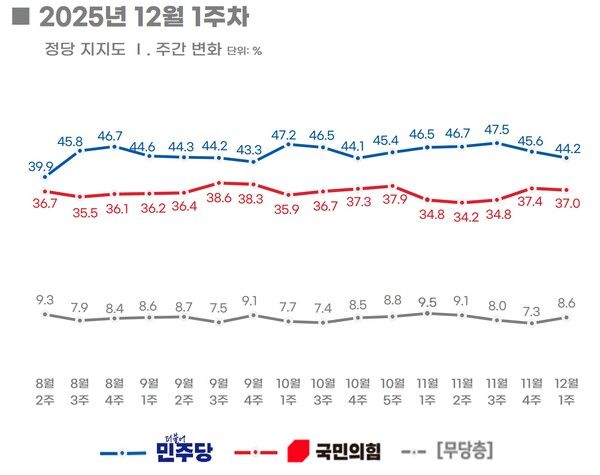 민주당은 '1인 1표제' 부결로 인한 당내 리더십 타격, 문진석-김남국 '인사 청탁' 논란 등이 불거지며 30대와 중도층에서 큰 폭으로 하락했다. 국민의힘은 비상계엄 1주년을 맞아 장동혁 대표의 계엄 사과 거부 등이 지지율 하락으로 이어졌다는 분석이다.