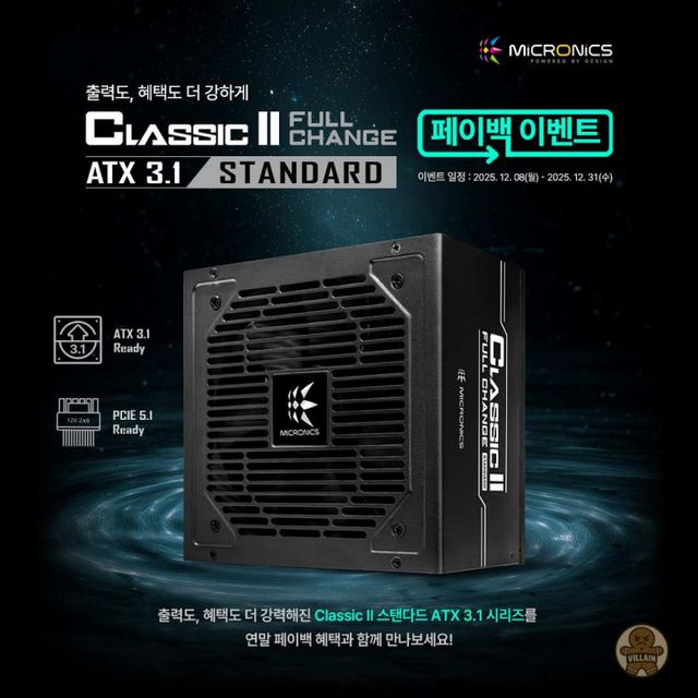 마이크로닉스가 클래식 II 풀체인지 80PLUS STANDARD ATX 3.1 전원공급장치 구매자를 대상으로 페이백 프로그램을 운영한다. 행사 기간 구매자는 간단한 인증 절차만으로 네이버페이 3,000원 교환권을 받을 수 있으며, 참여자 중 추첨을 통해 추가 기프티콘이 제공된다. 클래식 II ATX 3.1 시리즈는 550W·650W·750W 구성으로 DC to DC 구조, 2세대 GPU-VR 기술, 120mm HDB 팬, 애프터쿨링, 서지 보호 등 안정성과 내구성을 위한 설계를 갖췄다. 제품 보증 기간은 7년이다.