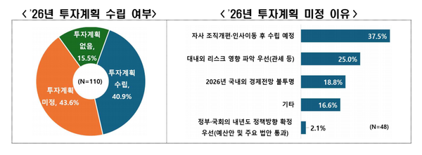[CEONEWS=김병조 기자] 통상 리스크, 고환율 등 대내외 경영환경의 어려움이 지속되면서, 주요 기업 10곳 중 6곳(59.1%)은 내년 투자계획이 없거나 아직 수립하지 못한 것으로 나타났다. 한국경제인협회(이하 한경협)는 여론조사기관 모노리서치에 의뢰해 매출액 500대 기업을 대상으로 「2026년 투자계획」(110개사 응답)을 조사해 이같이 밝혔다.