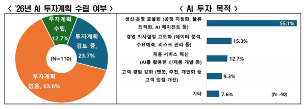 한편, 응답 기업 10곳 중 약 4곳(36.4%)이 AI 투자계획을 수립(12.7%)했거나 검토 중(23.7%)이라고 응답했다. AI 관련 투자계획이 없는 기업은 63.6%로 나타났다.
