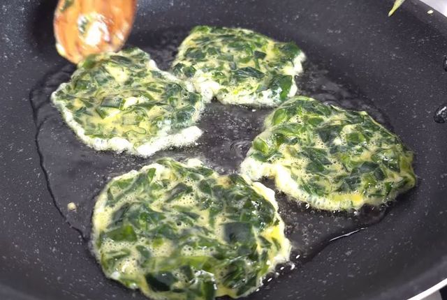 여기에 부침가루를 가볍게 묻히면 계란막 바깥에 또 하나의 얇은 보호층이 생긴다. 부침가루 속 전분은 열을 받으면서 표면을 바삭하게 굳혀주기 때문에 팬에 닿는 면을 지탱해주는 역할을 한다. 특히 미역처럼 질감이 미끄럽고 물기를 머금는 식재료는 직접 팬 위에 올리면 금세 형태가 무너지기 쉬운데, 전분막이 생기면 모양이 훨씬 안정적으로 유지된다. 결과적으로 미역 특유의 부드러움과 얇은 튀김옷의 대비가 살아 있는 식감이 만들어진다.