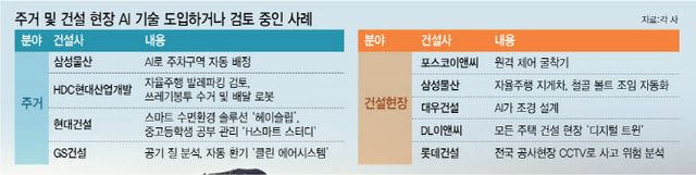 삼성물산 반포3주구 재건축 현장에는 자율주행 지게차, 자재 이동 로봇이 야간 시간대 현장에 쌓여 있는 나무판 등을 아파트 동별 지정 장소로 옮겨준다. 자동화 로봇이 철골 볼트를 조여주기도 한다. 대우건설은 의정부 탑석 푸르지오 파크7의 조경 설계를 AI에 맡기고 이를 형상화했다. 기존 설계자의 아이디어를 협력사에 구두 설명하는 과정에서 생겼던 오류 등이 해결됐다.
