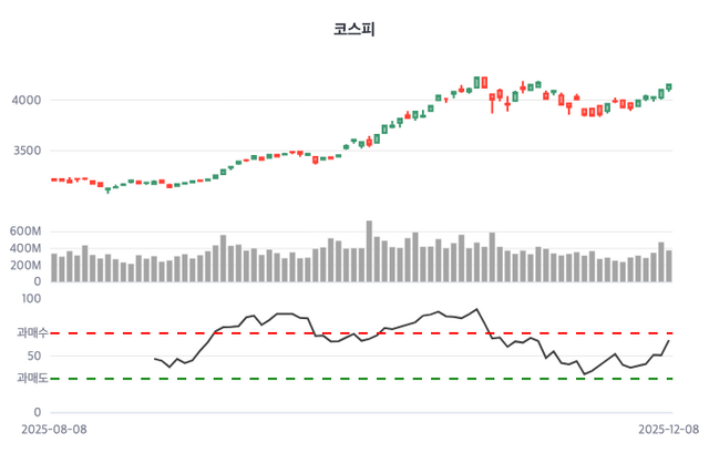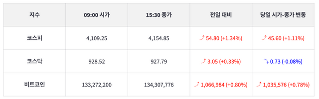 | 한스경제=김도현 기자 | 8일 코스피는 전거래일보다 1.34% 상승 마감했다. 한국거래소에 의하면 코스피 지수는 이날 오전 09시 4109.25에 개장해 장중 4153.09를 고점 기록한 후 오후 3시 30분 4154.85로 상승 마감했다. 전거래일 대비 54.80포인트(1.34%) 상승했으며, 이날 시작가 대비해서는 45.60포인트(1.11%) 상승한 것이다.