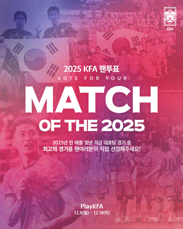 이번 투표는 올 한 해 각급 남녀 대표팀이 만들어낸 가장 인상적인 득점과 최고의 경기를 팬들이 직접 선정하는 연말 이벤트로, PlayKFA.com 웹사이트에서 참여할 수 있다.