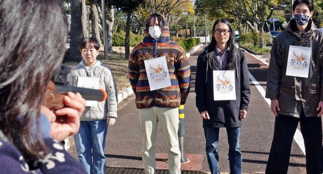 꽃사슴 유해동물 중단·생명 공존 제주행동이 8일 꽃사슴 포획 퍼포먼스를 하는 모습.