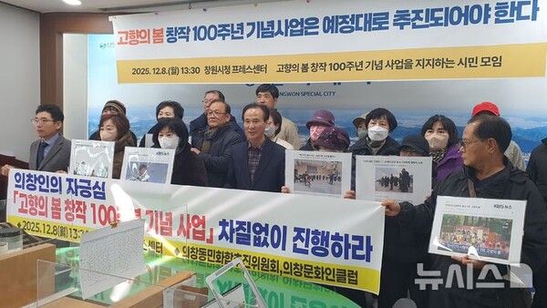 '고향의 봄 창작 100주년 기념 사업을 지지하는 시민 모임' 관계자들이 8일 경남 창원시청 프레스센터에서 기자회견을 열고 기념 사업의 정상적인 추진을 촉구하고 나섰다.
