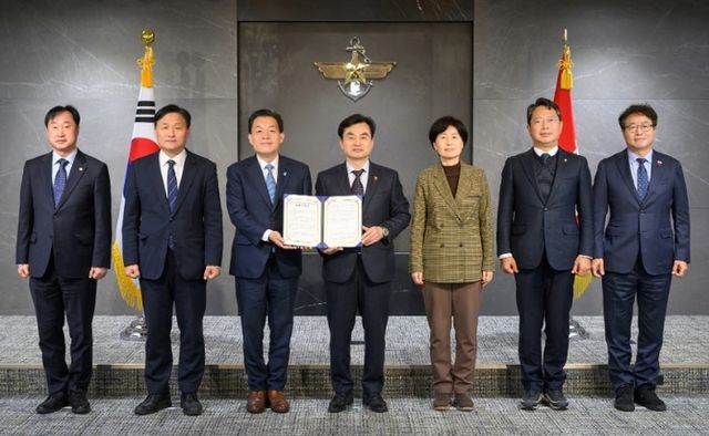 | ▲ 이재준 수원시장(왼쪽 세 번째)과 수원 지역 국회의원 5명이 안규백 국방부장관(왼쪽 4번째)에게 ‘수원 군 공항 이전의 국가전략 사업화를 위한 공동 건의문’을 전달한 후 함께하고 있다. 왼쪽부터 김준혁 의원, 김영진 의원, 이재준 시장, 안규백 장관, 백혜련 의원, 김승원 의원, 염태영 의원. 국방부 제공. |