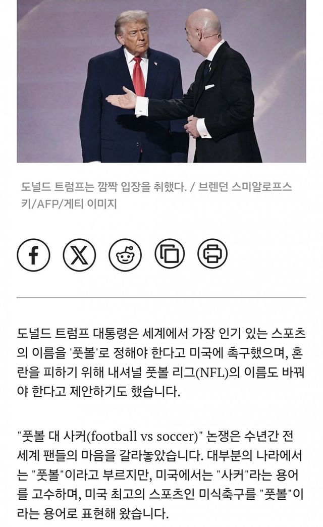 풋볼'로 정해야 한다고 미국에 촉구했으며, 혼란을 피하기 위해 내셔널 풋볼 리그(NFL)의 이름도 바꿔야 한다고 주장함.