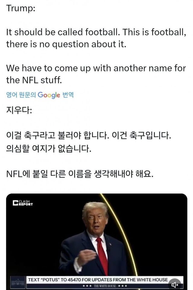 트럼프 대통령은 "미국에서 축구에 무슨 일이 일어났는지 살펴보면, 미국에서 축구는 Soccer인데, 우리는 그것을 FootBall이라고 부르지 않는 것 같습니다.