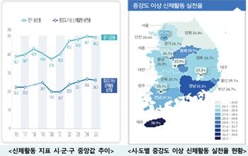 걷기실천율은 49.2%로 전년 대비 0.5%p 감소했지만, 코로나19 유행 이후 전반적으로 증가 추세다. 중강도 이상 신체활동 실천율은 26.0%로 전년 대비 0.6%p 감소했다.