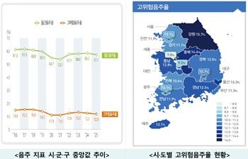 고위험음주율은 12.0%로 전년 대비 0.6%p 감소했고, 월간음주율은 57.1%로 전년 대비 1.2%p 감소했다. 코로나19 유행 시기 일시적으로 감소했다가 일상회복 이후 반등 추세였으나 최근 다시 소폭 감소세로 돌아섰다.