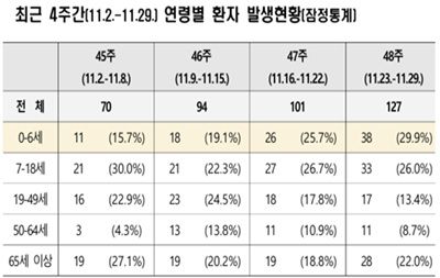 특히 47주(11월 16~22일) 101명에서 48주(11월 23~29일) 127명으로 늘어났으며, 작년 48주 80명과 비교하면 58.8% 증가한 수치다.