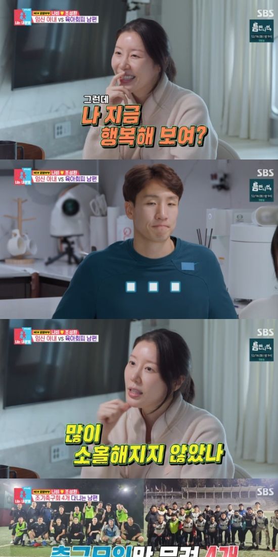 나비는 축구교실을 열심히 운영하면서 바쁘게 하루하루를 보내는 남편 조성환을 이해하면서도 아침시간만큼은 첫째 아들을 위해 시간을 잠깐이라도 내서 육아를 함께했으면 좋겠다는 바람을 전했다. 특히 나비는 현재 둘째를 임신 중이라고.