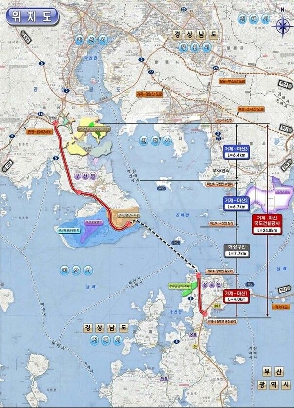 반면, 구산면 심리~거제시 장목면 관포리 11.7km(해상 7.7km, 육상4.0km) 구간은 거가대로 손실보전금 부담 동의안 의결 문제로 장기간 표류해 왔다.