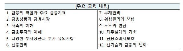 금감원은 실용금융 교육을 통해 △금융투자 △신용관리 △노후와 연금 △재무설계 등을 교육한다.