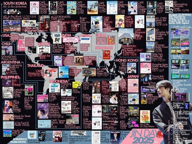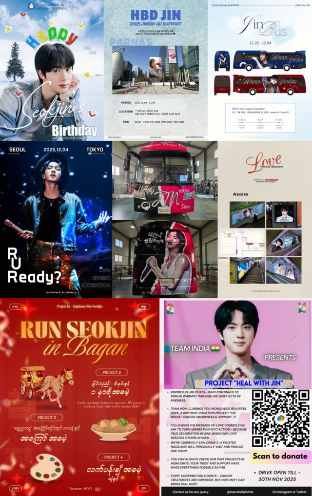 중국 팬베이스 차이나 진바(@ChinaJinBar)는 지하철 2호선 신촌역, 건대역, 사당역에 DID 광고를 게재해 생일 축하 메시지를 전했다. 미얀마 팬베이스(JIN MYANMAR)는 유네스코 세계유산 바간에서 ‘2025 JIN DAY BIRTHDAY PROJECT’를 열어 독창적인 방식의 생일 축하로 주목을 받았다. 핫에어벌룬 비행 중 축하 플래카드를 띄웠고, 무료 마차 체험(33대), 전통 튀김 스낵 뷔페, 미얀마 전통 문양 핸드페인팅(Yun-Kanut), 아난다 사원 오일 램프 1800개 점등식 등 현지 문화를 결합한 이색 프로그램이 이어졌다.