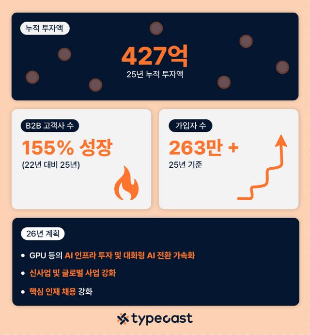 타입캐스트는 생성형 AI 도입 확산 속에 빠른 성장세를 보이고 있다. 11월 30일 기준 누적 가입자 수는 263만 명을 돌파했으며, 올해 매출은 100억 원을 넘어설 전망이다.