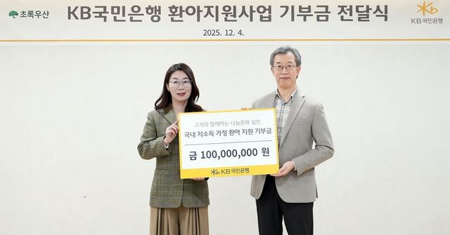 아동복지기관 초록우산에 1억원의 기부금이 전달됐다. KB국민은행이 저소득 가정 환아를 돕기 위해 마련한 금액이다.