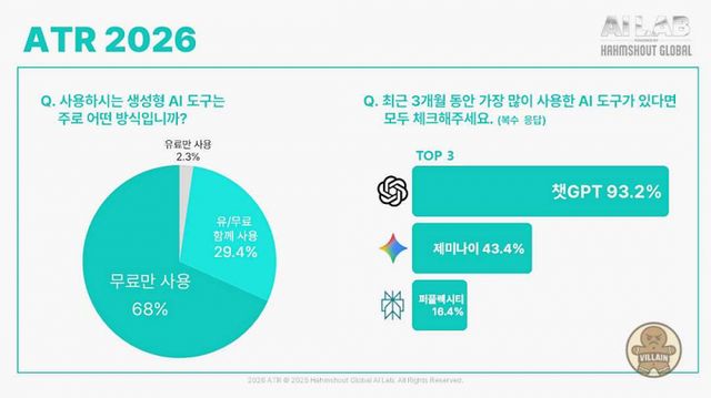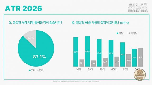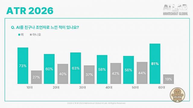 함샤우트 글로벌이 생성형 AI 인식·활용 트렌드를 분석한 ATR 2026을 발표했다. AI 인지율은 87%, 사용률은 73%로 인지와 활용 간 간극이 확인됐으며, 챗GPT 사용률은 93%로 사실상 표준 도구로 자리 잡았다. 사용 이유는 시간 절약과 효율 향상이 중심이며, 60대는 사용률이 낮아도 AI를 정서적 조언자로 받아들이는 경향이 강하게 나타났다. 함샤우트 글로벌은 리포트를 사람 중심 AI 이해를 위한 연례 조사로 정례화한다는 목표를 밝혔다.