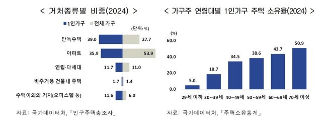 주택 소유율은 32.0%로 전체 가구 56.9%에 비해 크게 낮았다. 다만 연령대가 높을수록 소유율도 올라 70세 이상이 50.9%로 가장 높았고 60대 43.7% 50대 38.6% 순이었다. 젊은 1인 가구는 ‘세입자 중심’ 고령 1인 가구는 ‘자가 보유 중심’으로 갈리는 구조가 읽힌다.