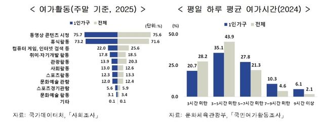 여가 측면에서는 혼자 사는 시간이 늘어난 만큼 생활의 결도 달라졌다. 1인 가구의 주말 주된 여가활동은 동영상 콘텐츠 시청이 75.7%로 가장 많았고 휴식 73.2%가 뒤를 이었다.