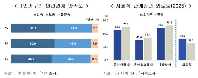 사회적 관계망에서도 같은 경향이 나타났다. 2025년 기준 1인 가구의 48.9%가 평소 자주 또는 가끔 외롭다고 답했다. 전체 평균보다 10.7%포인트 높게 나타났다. 도움받을 사람이 있는지 묻는 항목에서도 1인 가구의 응답은 전반적으로 낮았다. 1인 가구 중 “몸이 아플 때 도와줄 사람이 있다”는 응답은 68.9%였고 “돈을 빌려야 할 때 도움받을 사람이 있다”는 응답은 45.6%였다.