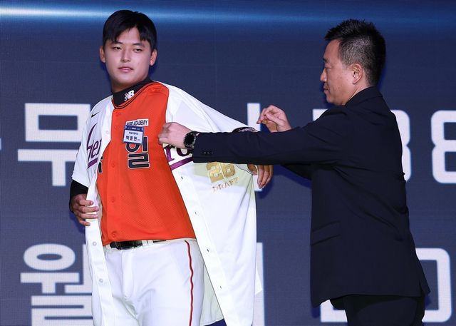 ‘2026 KBO 신인 드래프트’에서 1라운드 1순위로 키움 히어로즈에 선발된 박준현이 유니폼을 입고 있다. / 뉴스1