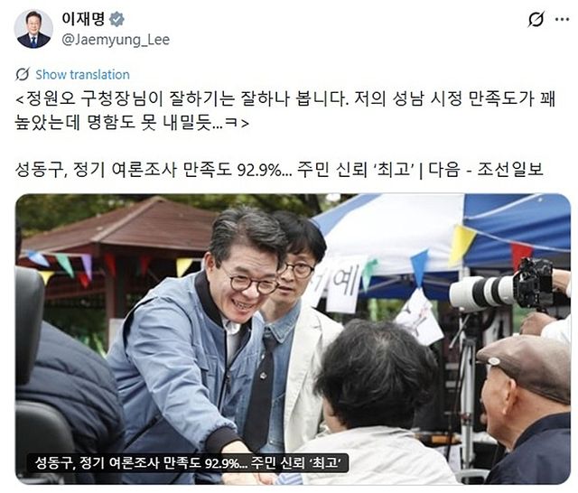 이 대통령은 지난 8일 자신의 엑스(X·옛 트위터)에 성동구가 실시한 구정 만족도 조사 결과를 전한 언론 보도를 공유하며 “정원오 구청장님이 잘하기는 잘하나 보다. 저의 성남 시정 만족도가 꽤 높았는데, 명함도 못 내밀겠다”고 적었다.