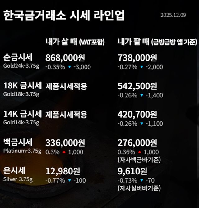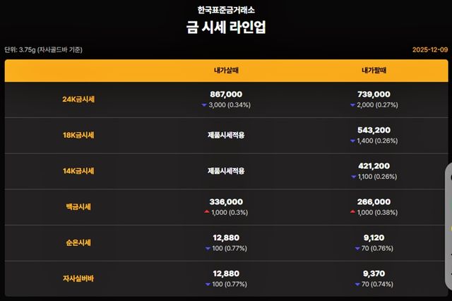 국내 금시세(금값)가 9일(한국 시각) 오후 하락세(전 거래일 대비)를 보이고 있다.
