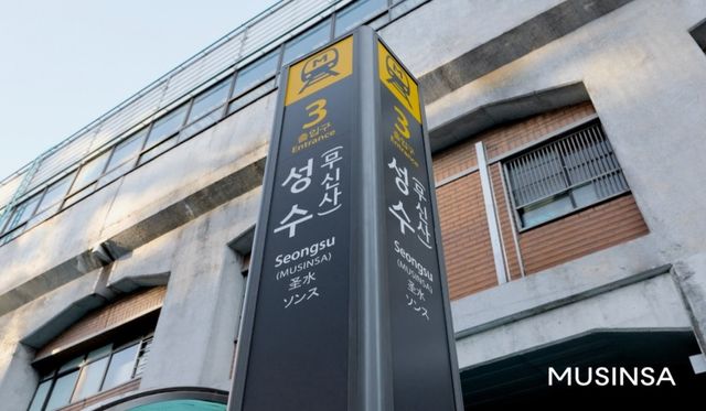 서울 지하철 2호선 성수역 출구 표지판에 무신사가 병기된 모습 / 무신사