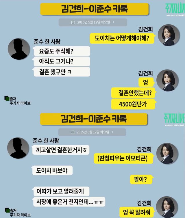 주진우 시사인 편집위원은 8일 유튜브 방송 '주기자 라이브'에서 "적어도 2015년까지 이준수가 김건희의 주가조작에 대해 컨설팅을 해줬다는 증거"라며 김 여사와 이씨가 2015년 5월 12일 주고받은 카카오톡 문자메시지를 공개했다.