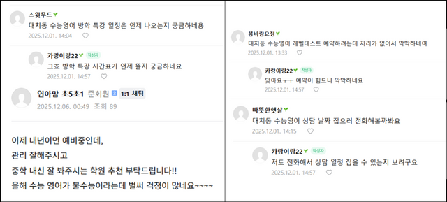 이미 여러 맘카페에서는 "대치동 수능 영어 방학 특강 일정이 언제 나오느냐", "레벨테스트 예약을 하려는데 자리가 없어 걱정된다", "상담 날짜 잡으려고 전화해보려 한다" 등 2027학년도 수능 대비를 위해 사교육 정보를 찾는 학부모들의 글이 꾸준히 올라오고 있다.