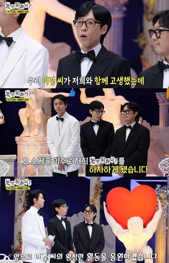 "갑작스럽게 저희가 결방이 되고, 날짜가 픽스가 돼서 시청자 여러분께 이경 씨가 마지막 인사를 직접 드리지 못하고 떠나게 됐다"는 유재석은 "앞으로 이경 씨 왕성한 활동 저희도 응원하겠다. 수고했다"고 박수를 보내며 이이경의 하차 인사를 대신했다.