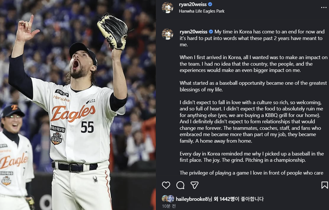 와이스는 "한화 구단은 독립리그에 나온 남자가 많지 않을 때 (날)믿었다"며 "그들은 내게 기회와 플랫폼, 그리고 내가 가장 필요할 때 집을 줬다. 영원히 감사할 것이다. 한국은 언제나 나의 일부일 것이다. 지금의 작별은 영원히 안녕이 아니다. '다시 만나자'"라고 했다.