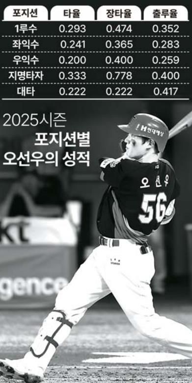 외국인 타자를 외야수로 선호하는 가장 큰 이유는 오선우의 포지션과 맞닿아 있다. 오선우는 올 시즌 124경기에 출전해 타율 0.265(437타수 116안타)를 기록했다. 포지션마다 생산력이 달랐는데, 1루수로 나섰을 때 타율이 0.293(232타수 68안타)로 높았다. 출루율과 장타율 역시 1루수로 출전했을 때 안정적이었다. 반면 수비 부담 탓인지 외야수 비중이 높았던 후반기 개인 기록이 크게 휘청거리기도 했다. KIA는 이 같은 기록을 근거로, 오선우의 내년 시즌 1루 포지션 고정을 진지하게 검토하고 있다.
