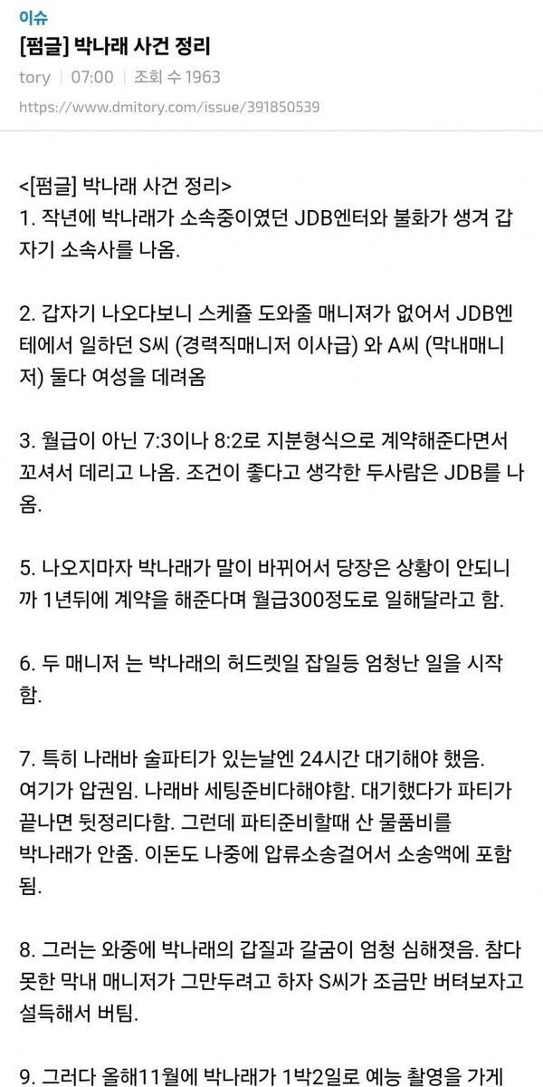 사건의 발단은 박나래의 1인 기획사 앤파크에서 함께 일했던 여성 매니저 두 명이 퇴사를 결심하면서 시작됐다.
