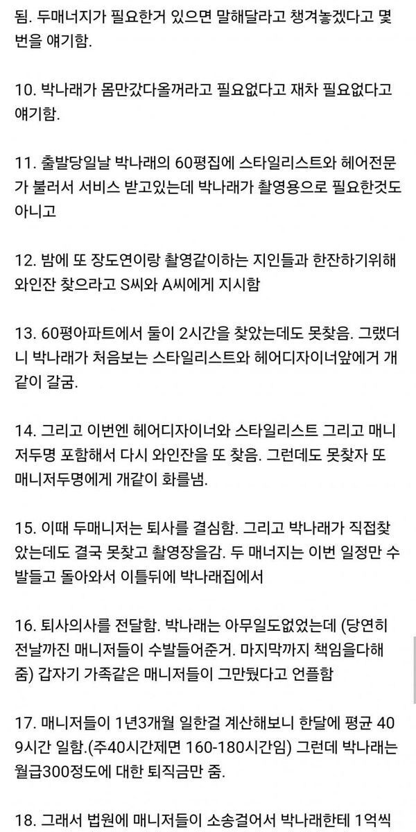 특히 박나래가 자택인 ‘나래바’에서 주최한 파티에서 각종 음식 재료를 구매하고 세팅 및 뒷정리를 매니저들이 전담해야 했으며, 물품 구입비조차 정산되지 않았다고 전했다.