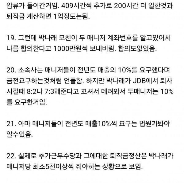 또한 매니저들이 회사의 전년도 매출 10%를 요구하며 액수를 점차 올려 수억원대에 이르렀다고 설명했다.