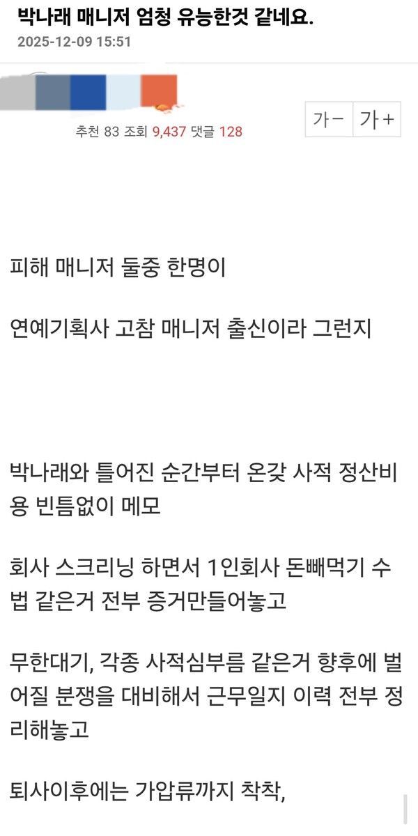또한 박나래의 모친 역시 근무 사실이 없음에도 5500만원 상당의 급여를 수령한 정황이 있다고 밝혔으며, 회삿돈으로 개인 주택의 관리비와 물품 구입 등에 최소 1억원 이상을 사용했다고 덧붙였다.