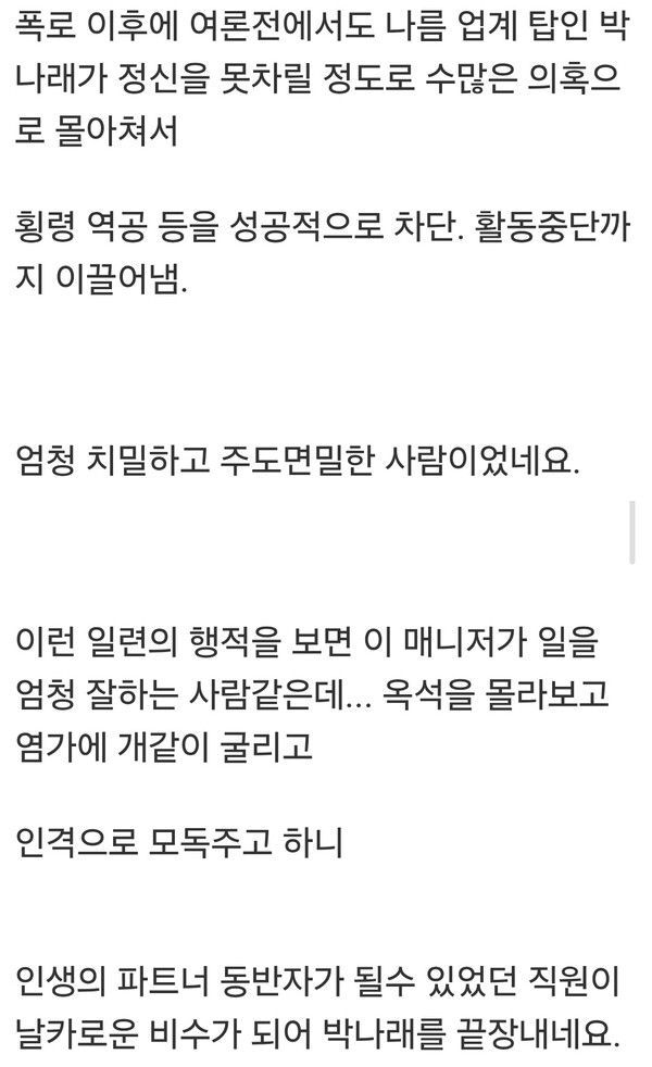 한편 박나래는 모든 사안에 대해 “책임을 통감하고 있다”고 밝히며 자진해서 방송 활동을 중단했다. 그는 “웃음을 드리는 직업을 가진 사람으로서 더는 민폐가 되고 싶지 않다”며 활동 중단 이유를 설명했지만, 사태가 어디까지 확산될지는 아직 불투명하다.